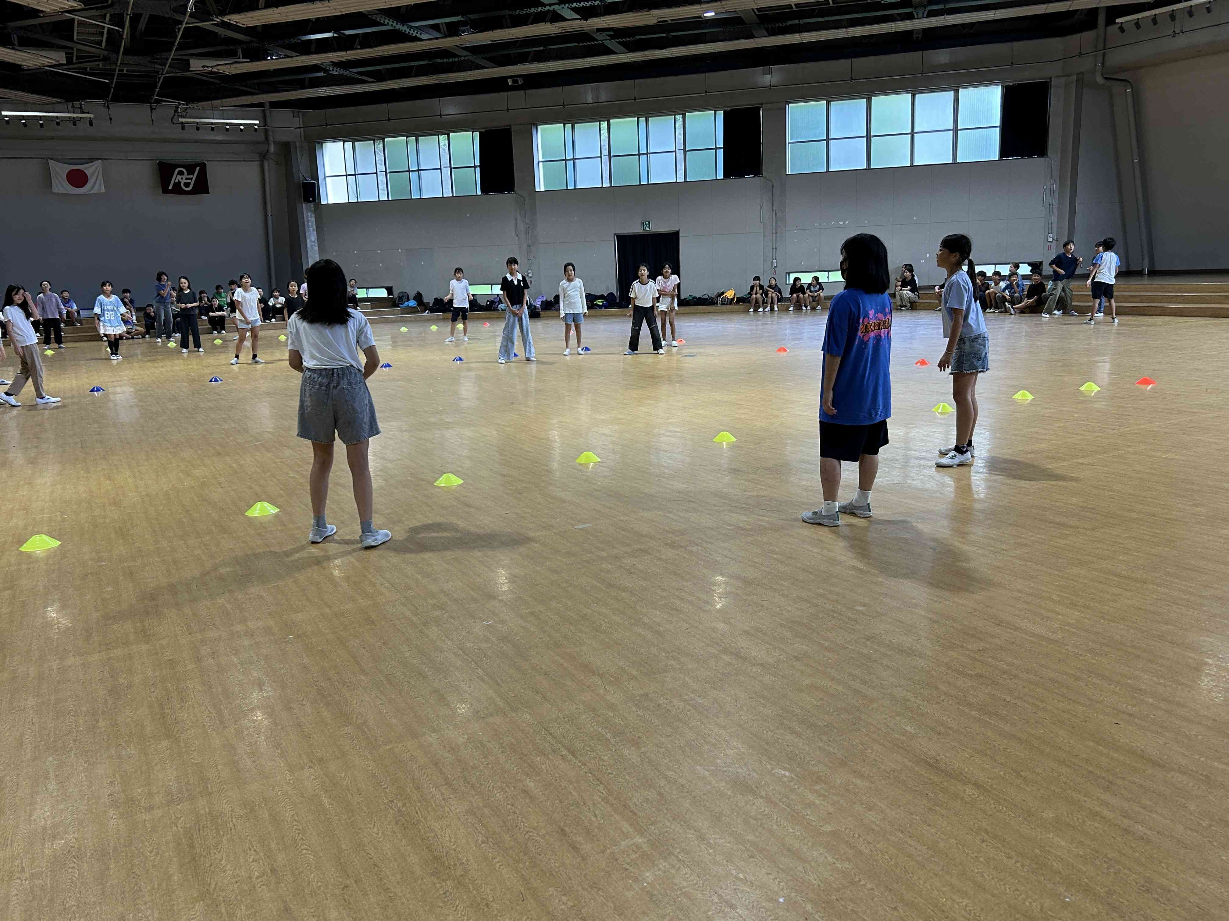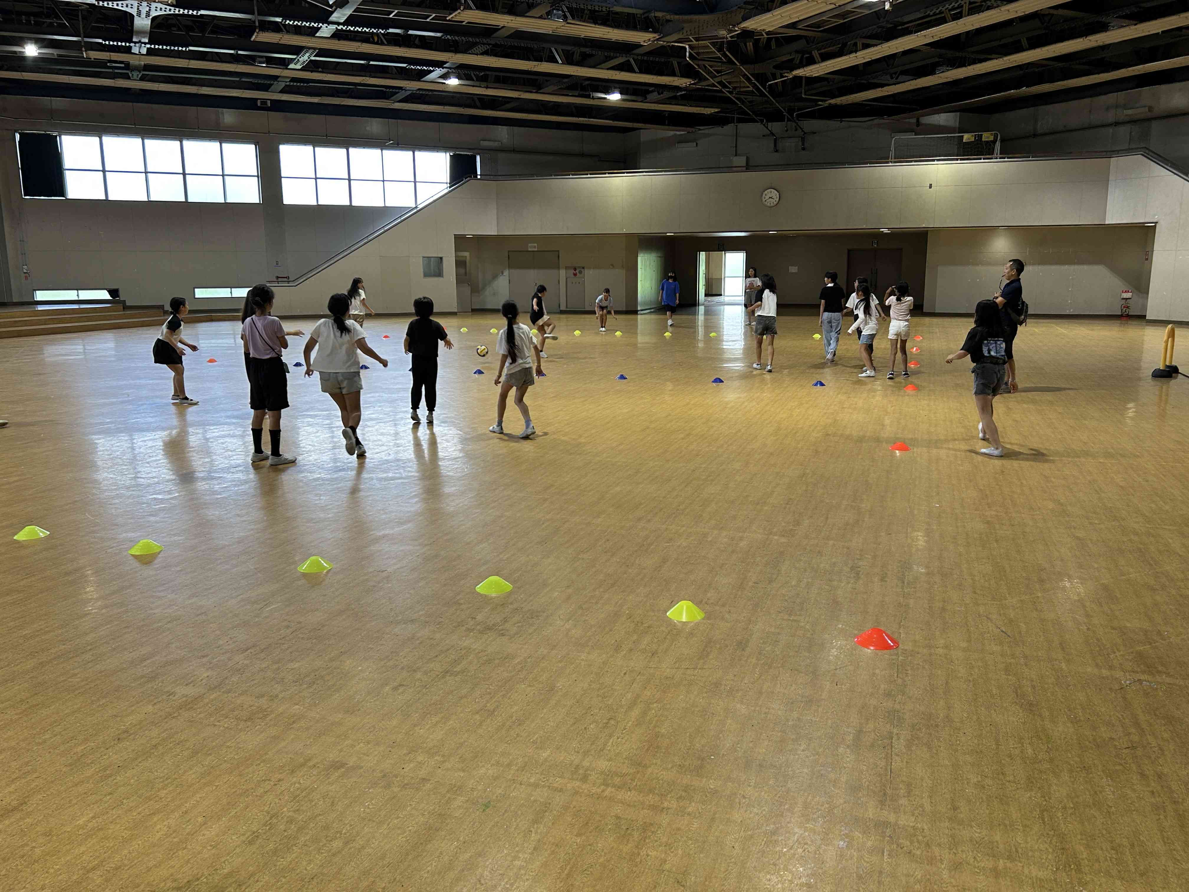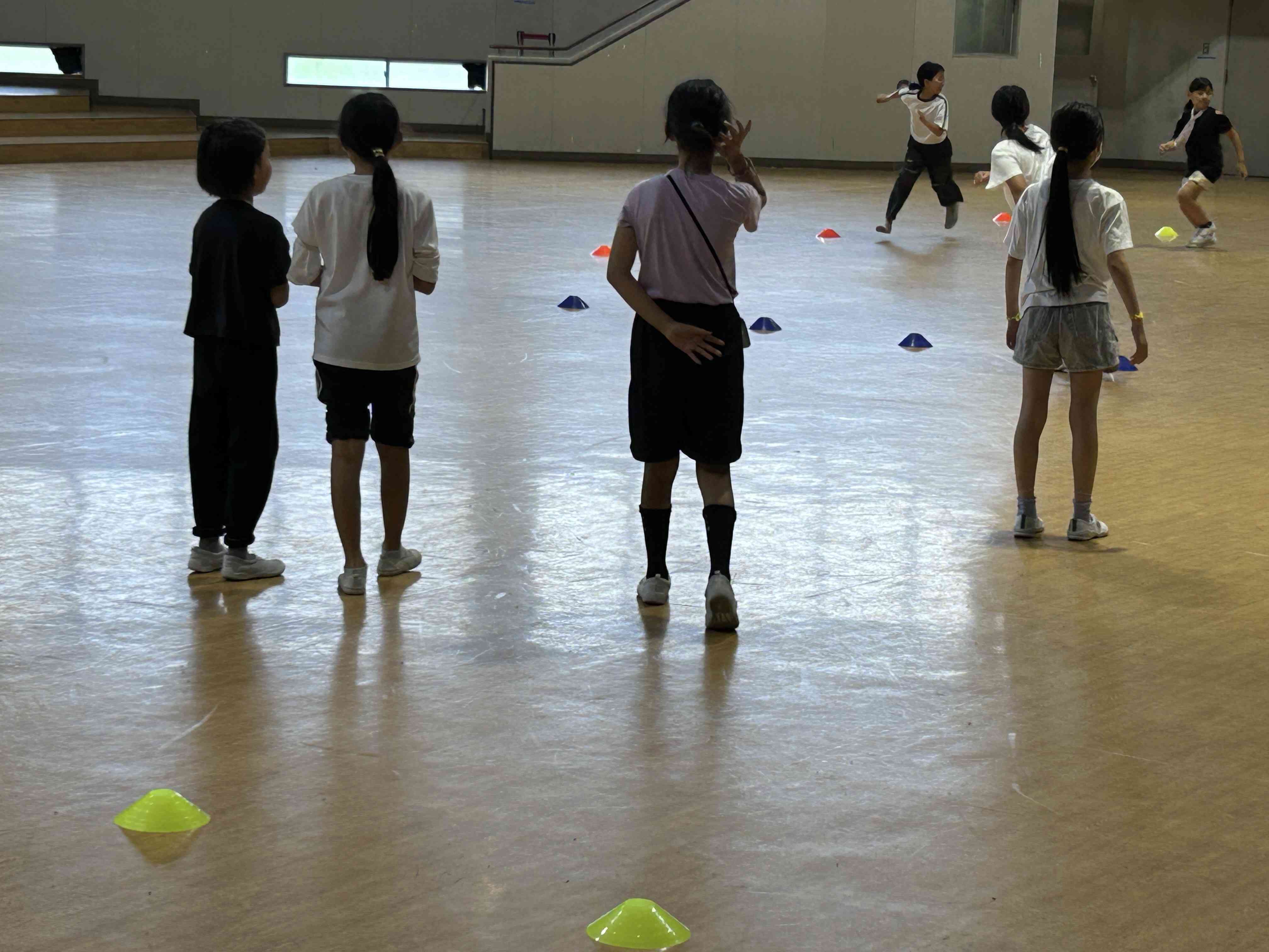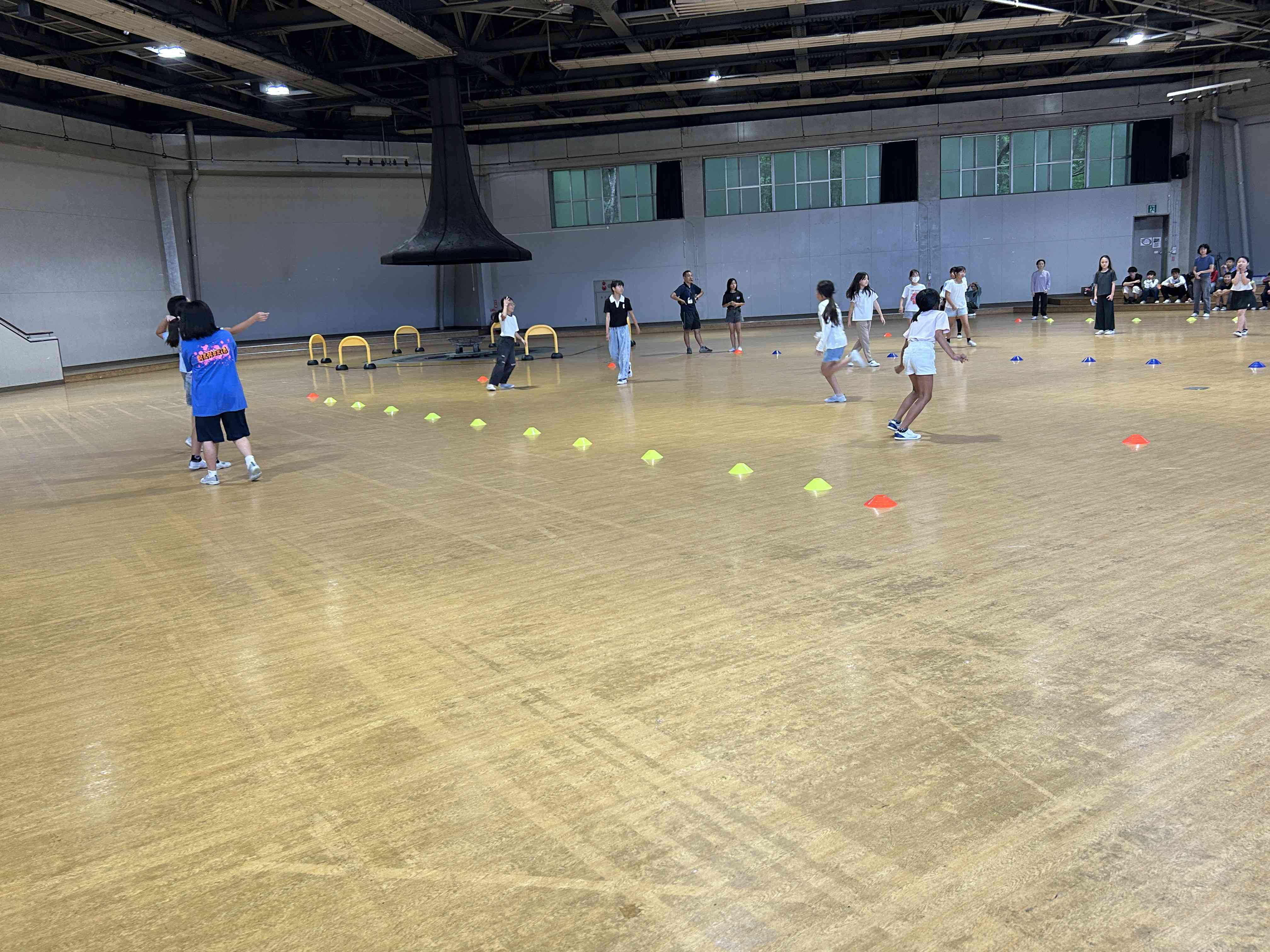 雷の音がしたため屋外の散策をやめて室内でドッチボールをすることになりました。