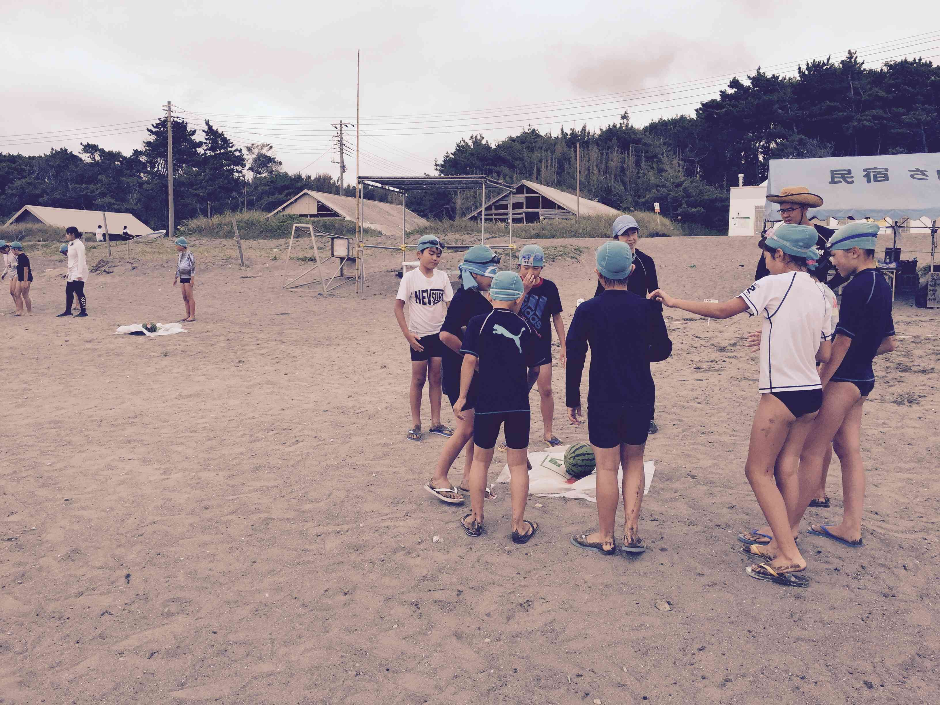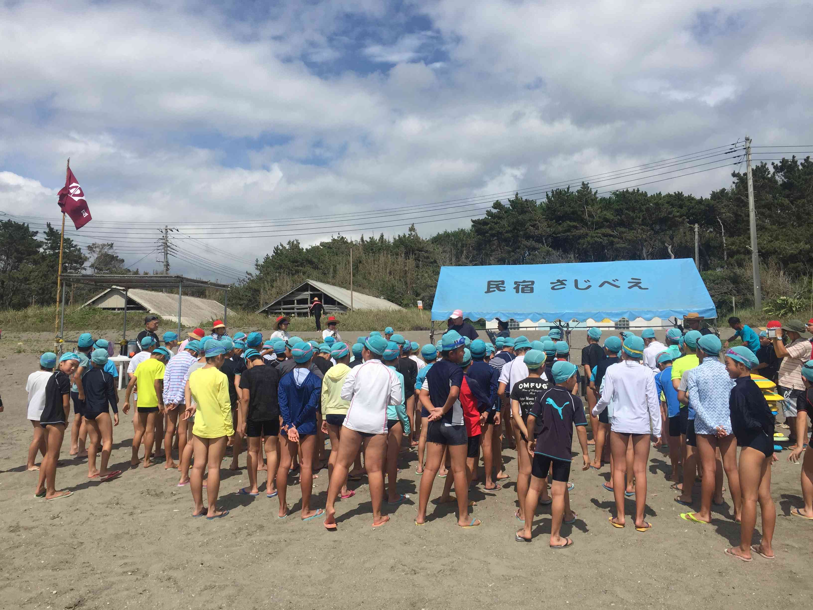 校旗掲揚式を行いました。 海で班ごとに安全に気をつけて泳ぐことができました。 その後は、スイカ割りもしました。 子どもたちはみんな元気です。