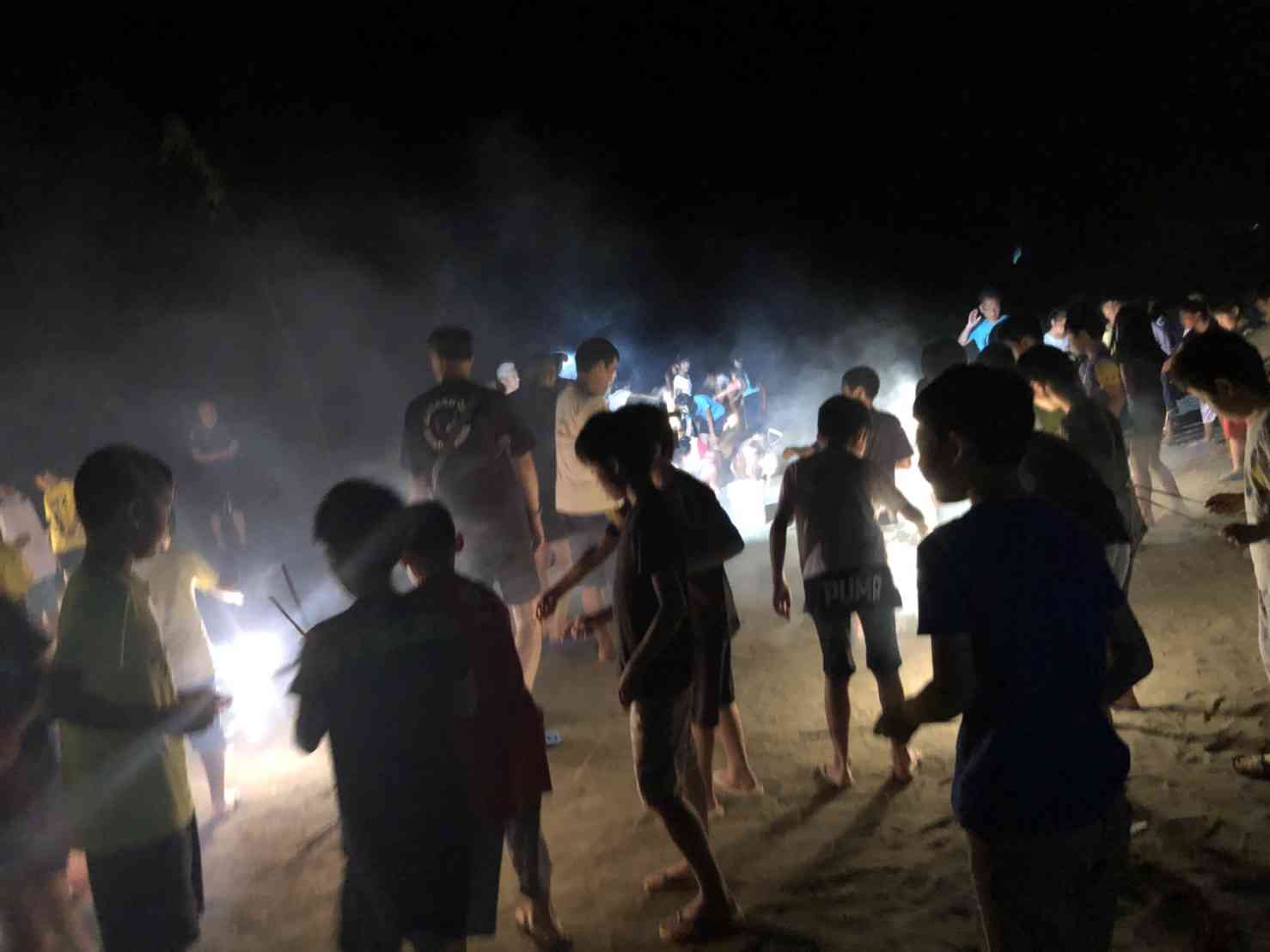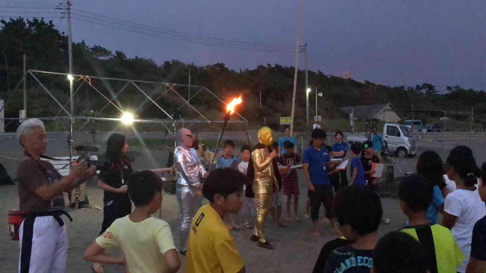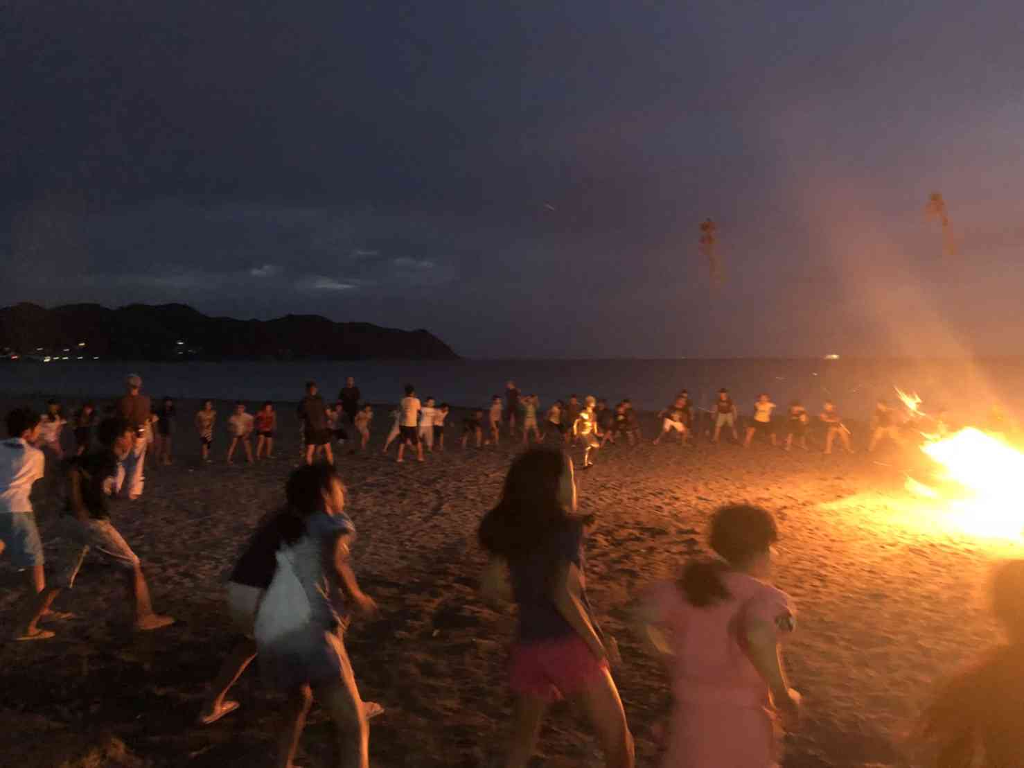 夜はキャンプファイヤーを行いました。 火の神と女神も登場し、一組は健康の火、二組は幸福の火、三組は笑顔の火をいただきました。 その後、力強いソーラン節を踊るなど大盛り上がりのレクリエーション、花火も綺麗でした。