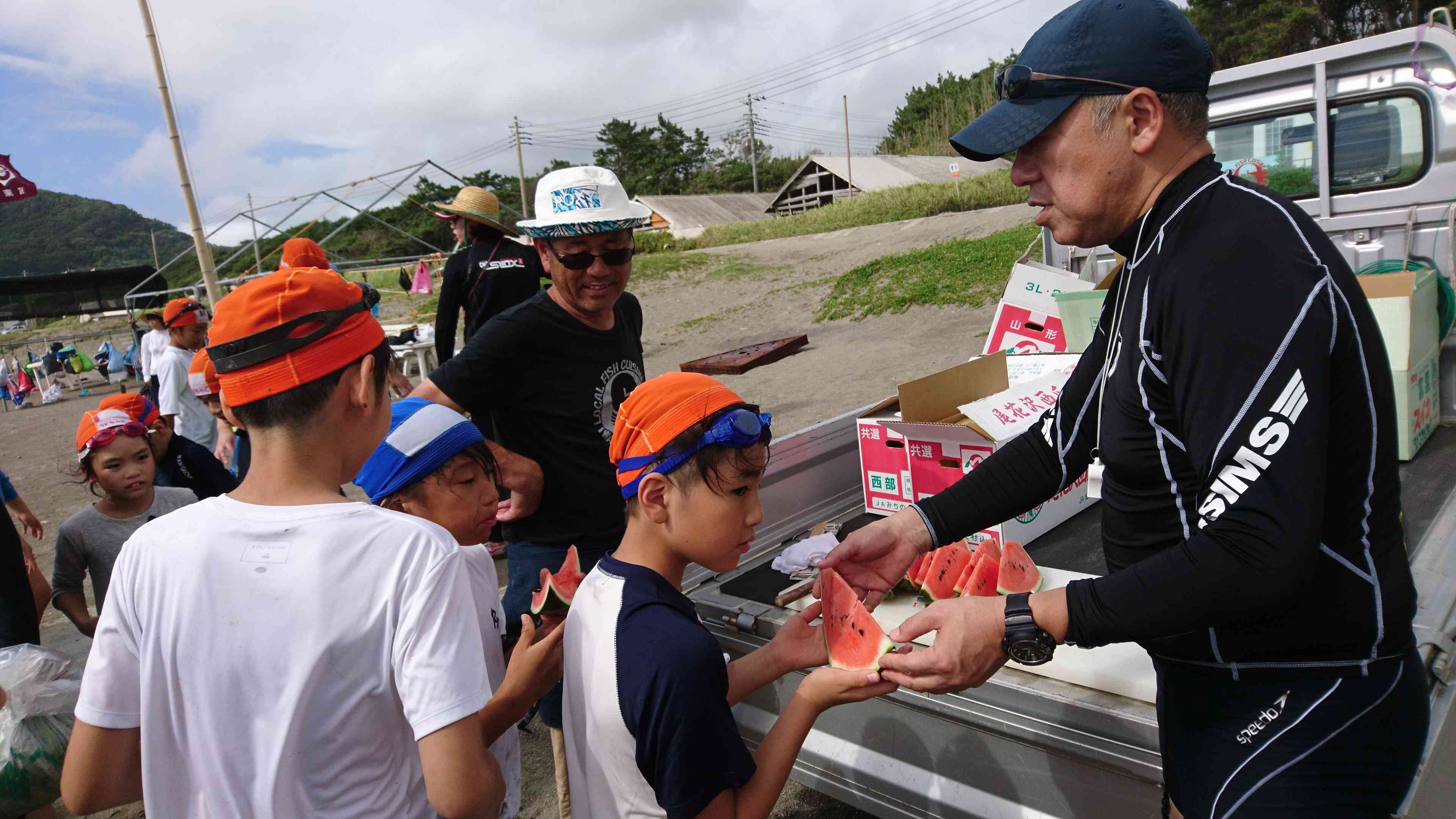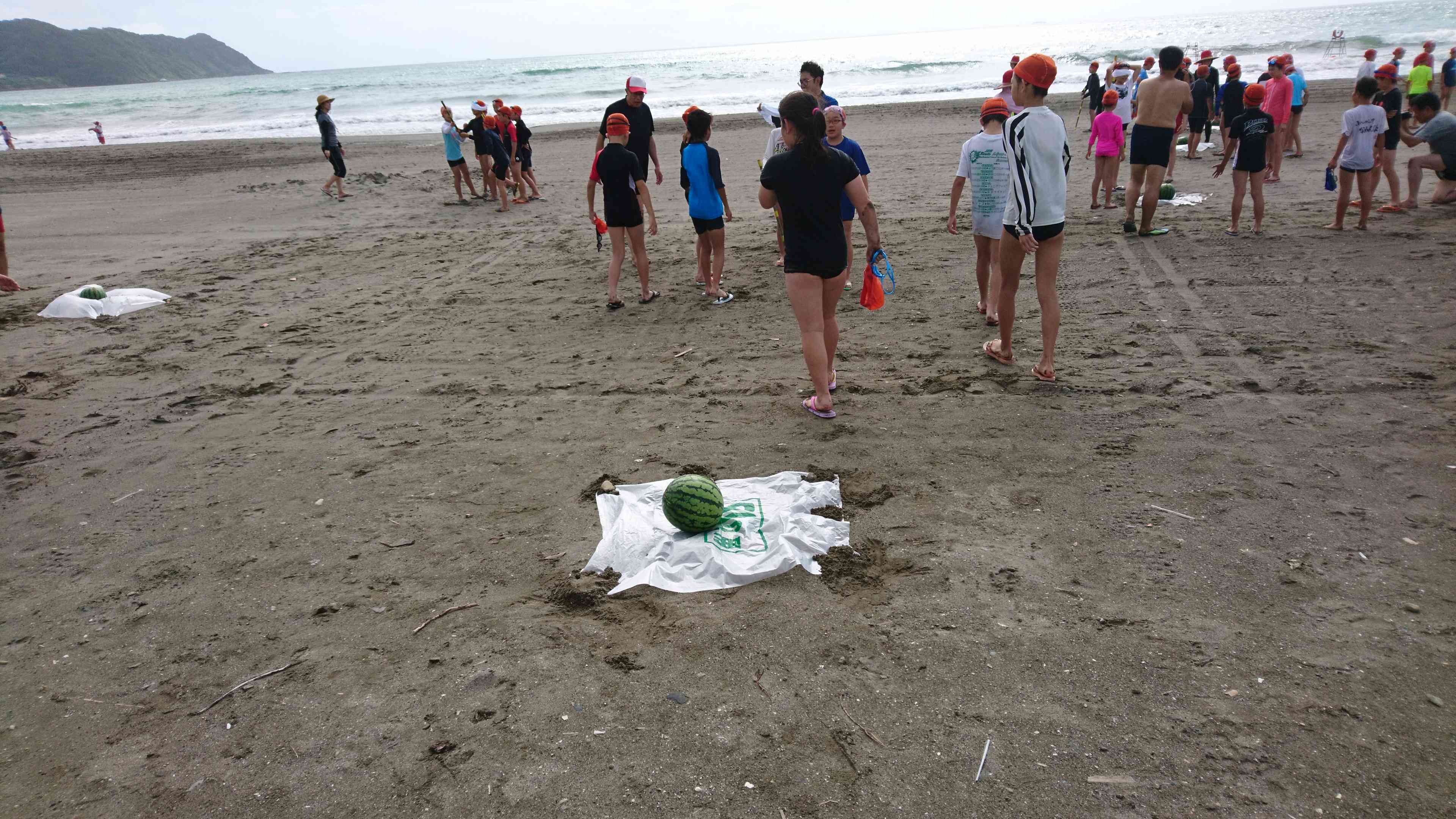 スイカわりをやりました。なかなかわるのが難しく何回も挑戦していました。スイカわりをしたあとは冷たいスイカをおいしく食べました。