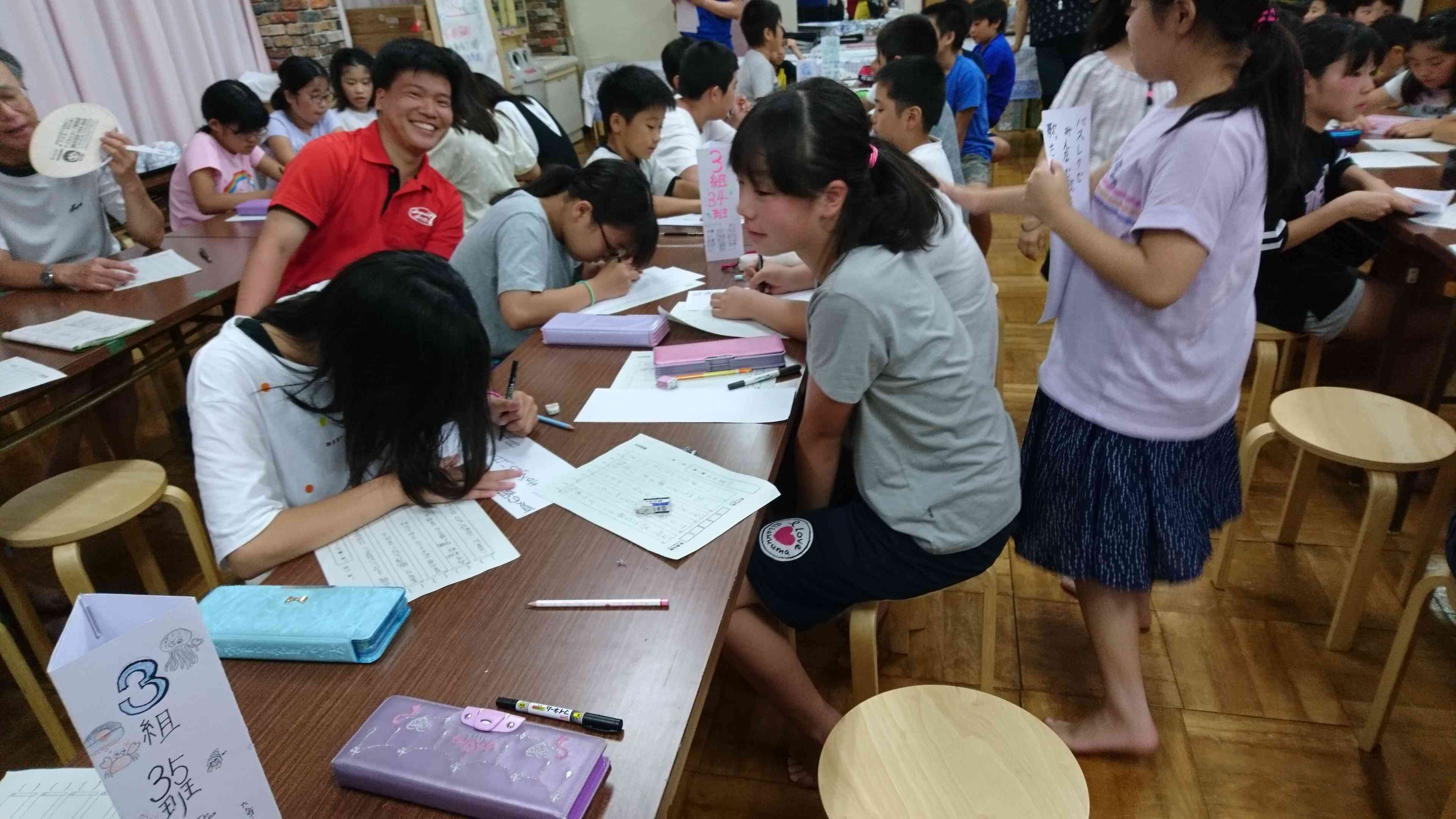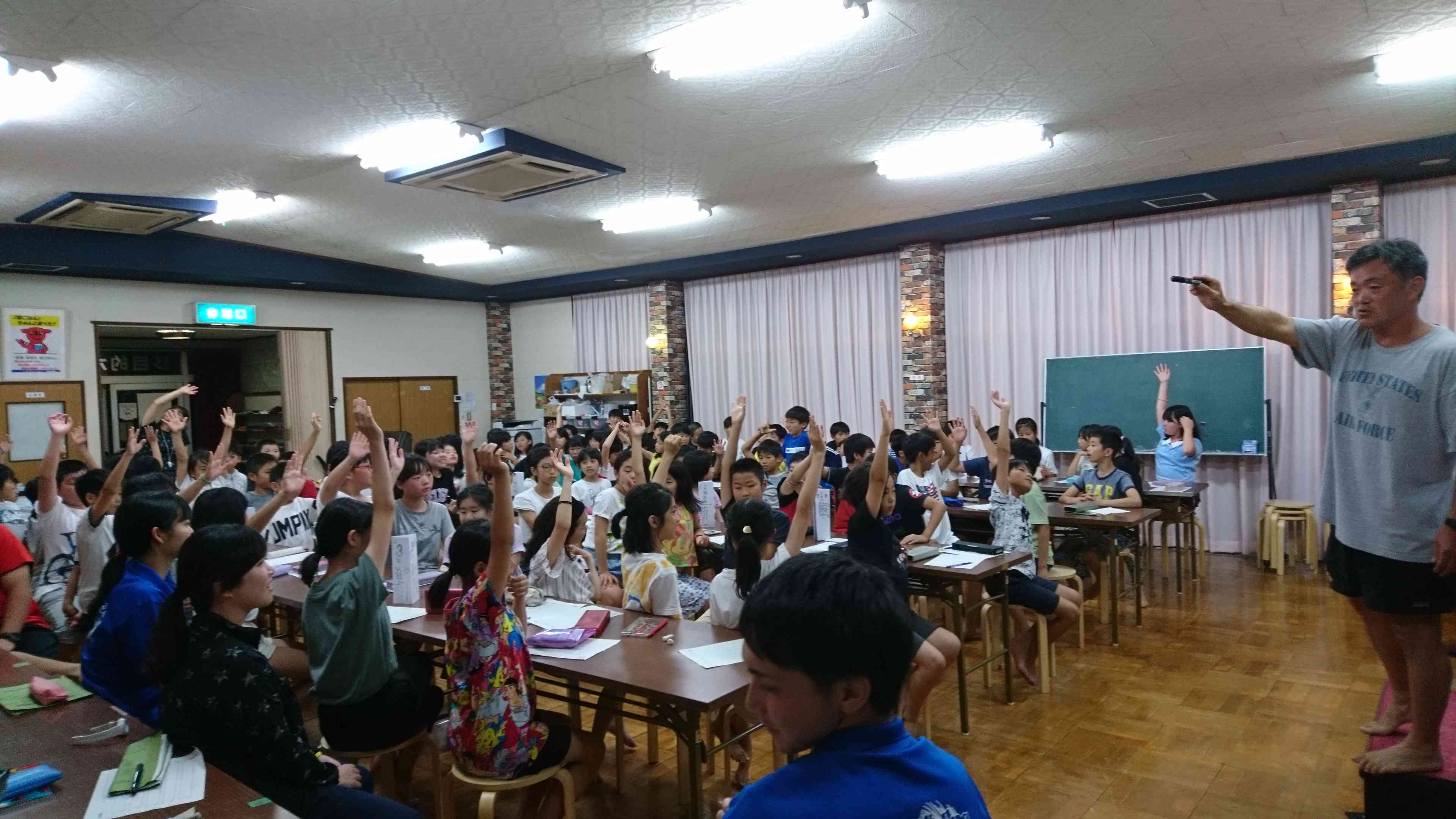 本日予定していたキャンプファイアーは明日に延期になりました。今日は俳句大会をやりました。一人一枚書いた俳句の中から一番いい作品をみんなで選びました。本当に盛り上がりました。