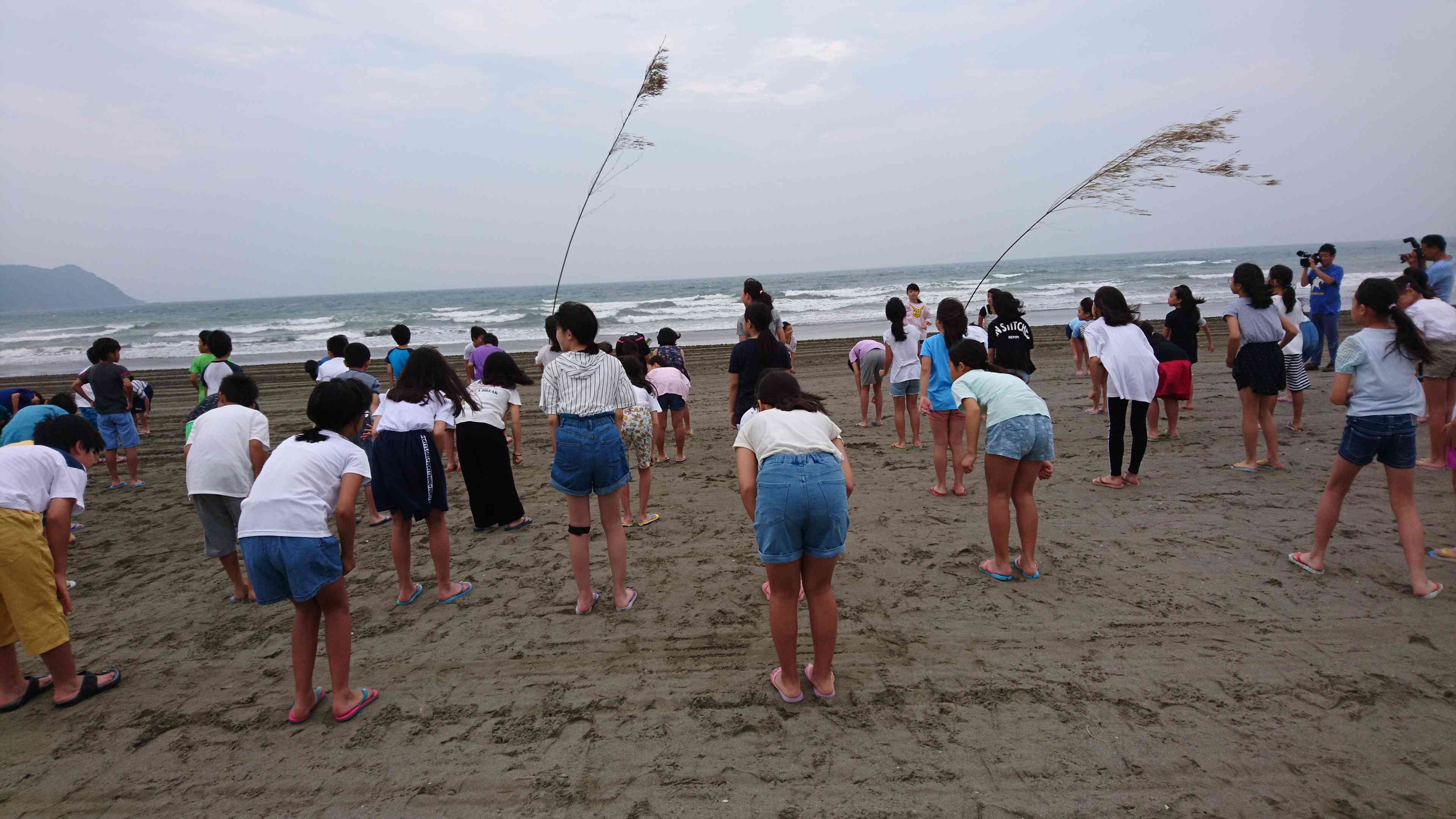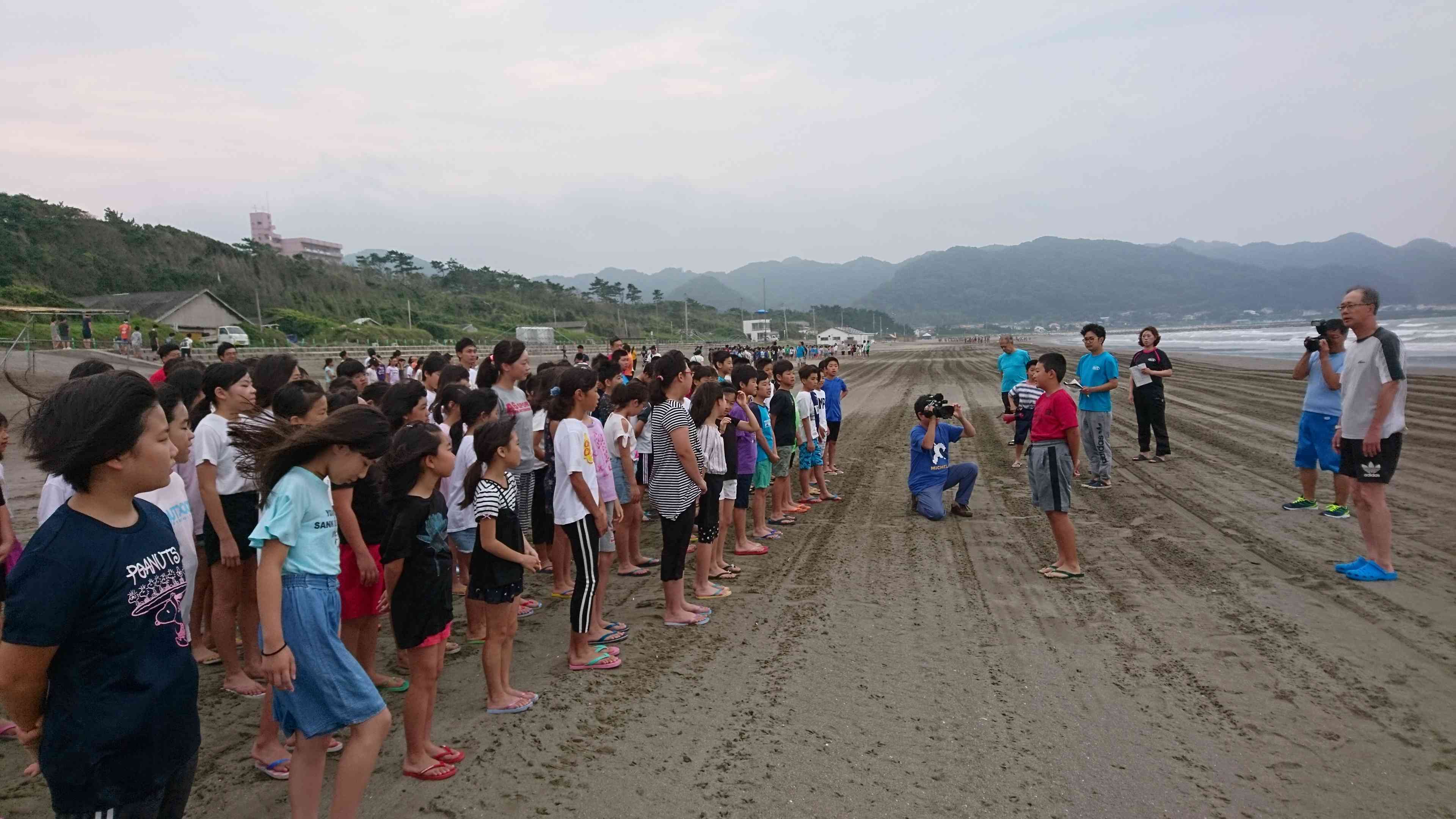 おはようございます。今朝の天気は曇り。海岸では風が少し強く吹いています。雨は降っていないので状況を見ながら海に入る予定です。 朝会を海岸で行い、ラジオ体操をしました。 昨晩、地震がありましたが、怪我人はいませんでした。 ご安心ください。