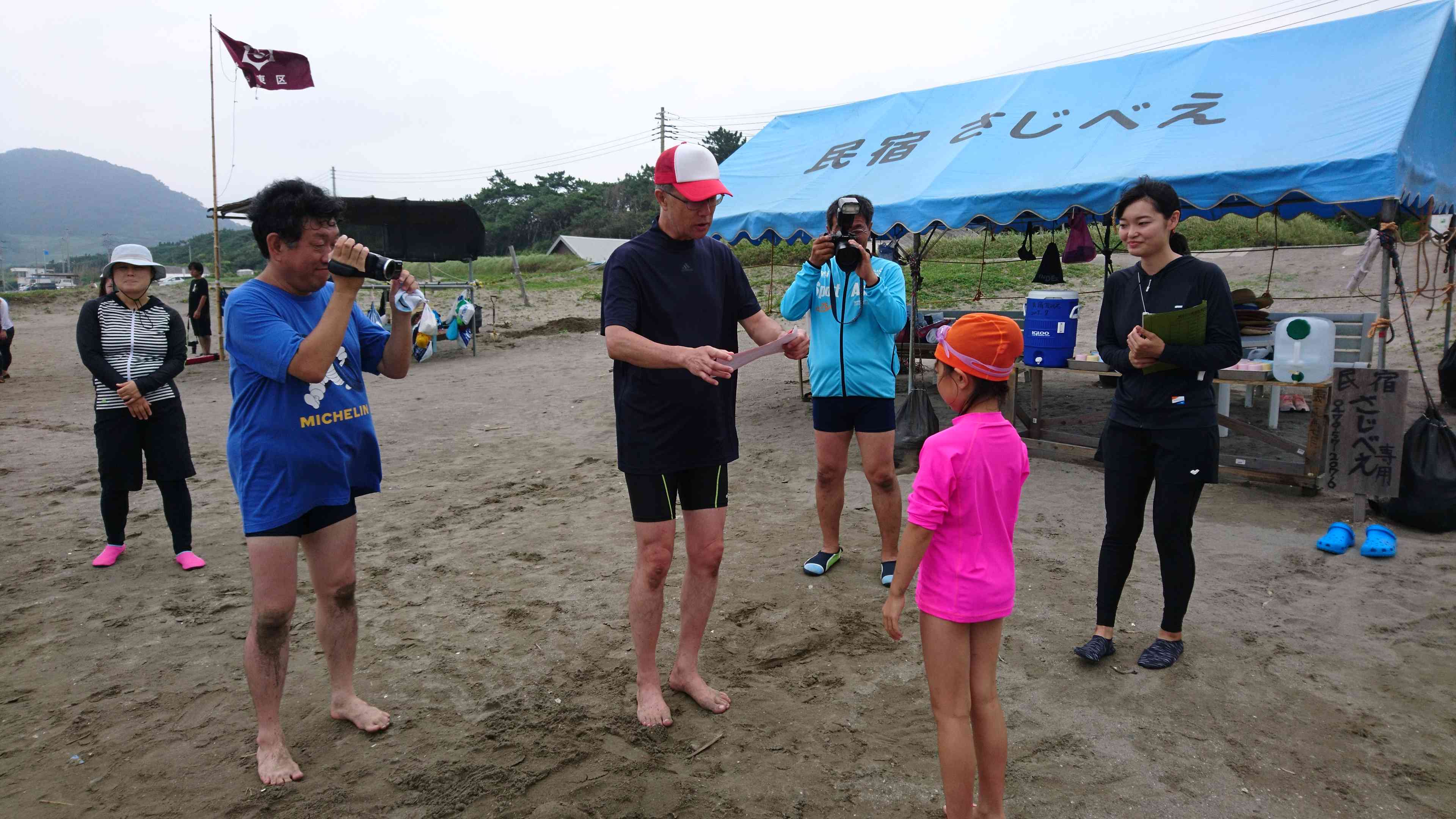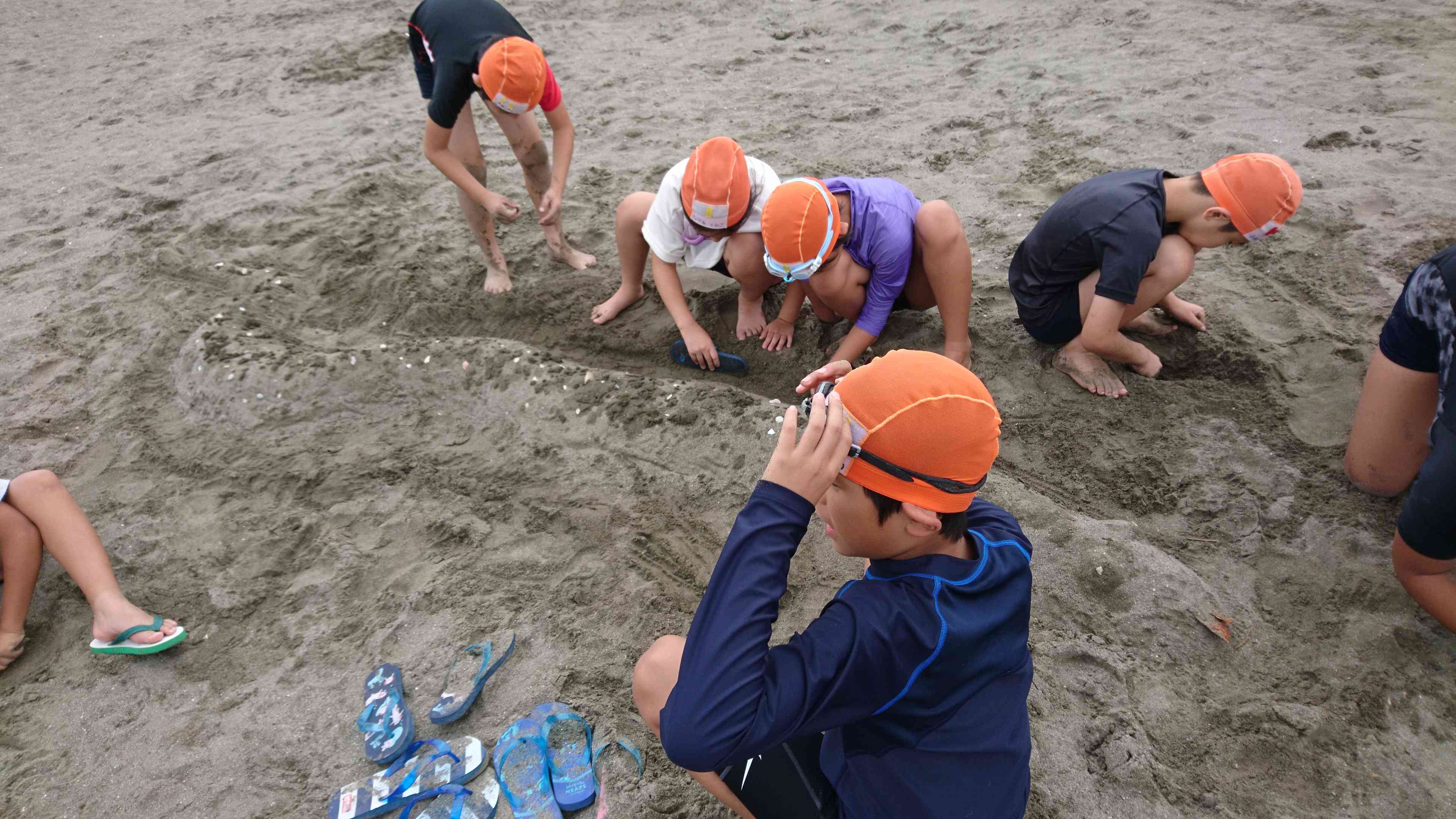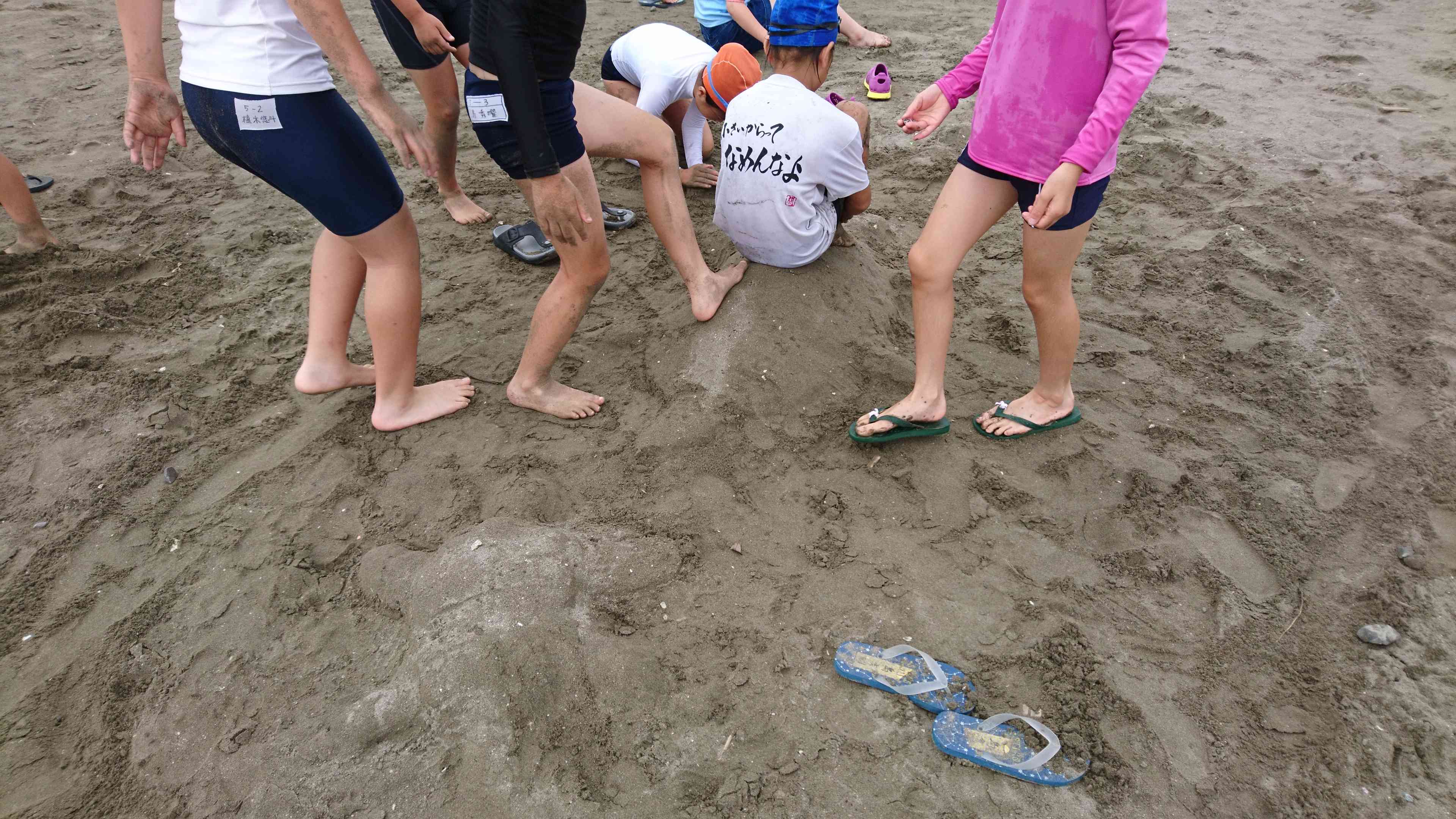 波が高いため、砂浜芸術大会を行いました。砂浜の砂を使い作品を作りました。グループごとに作品を作り楽しみました。