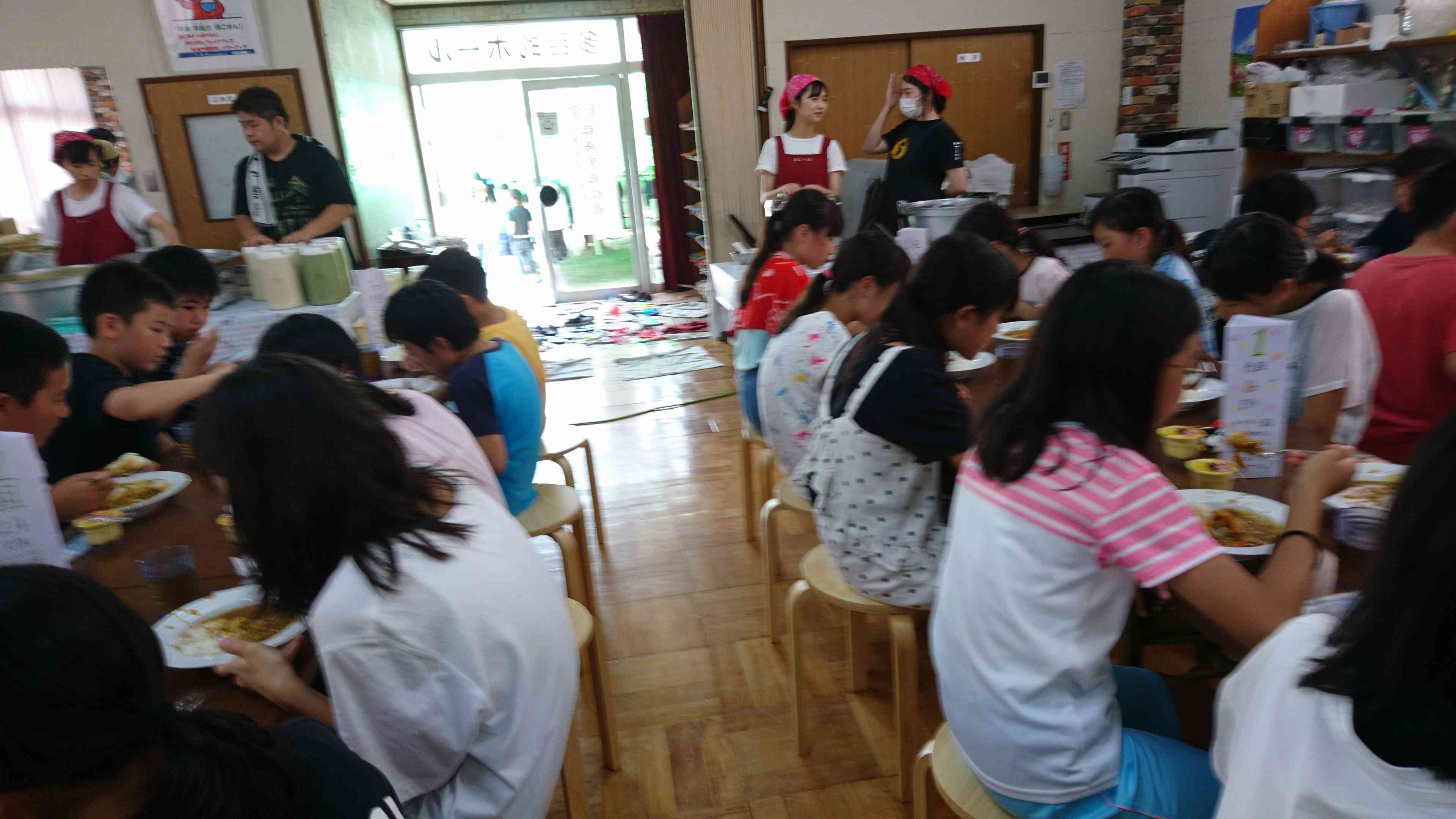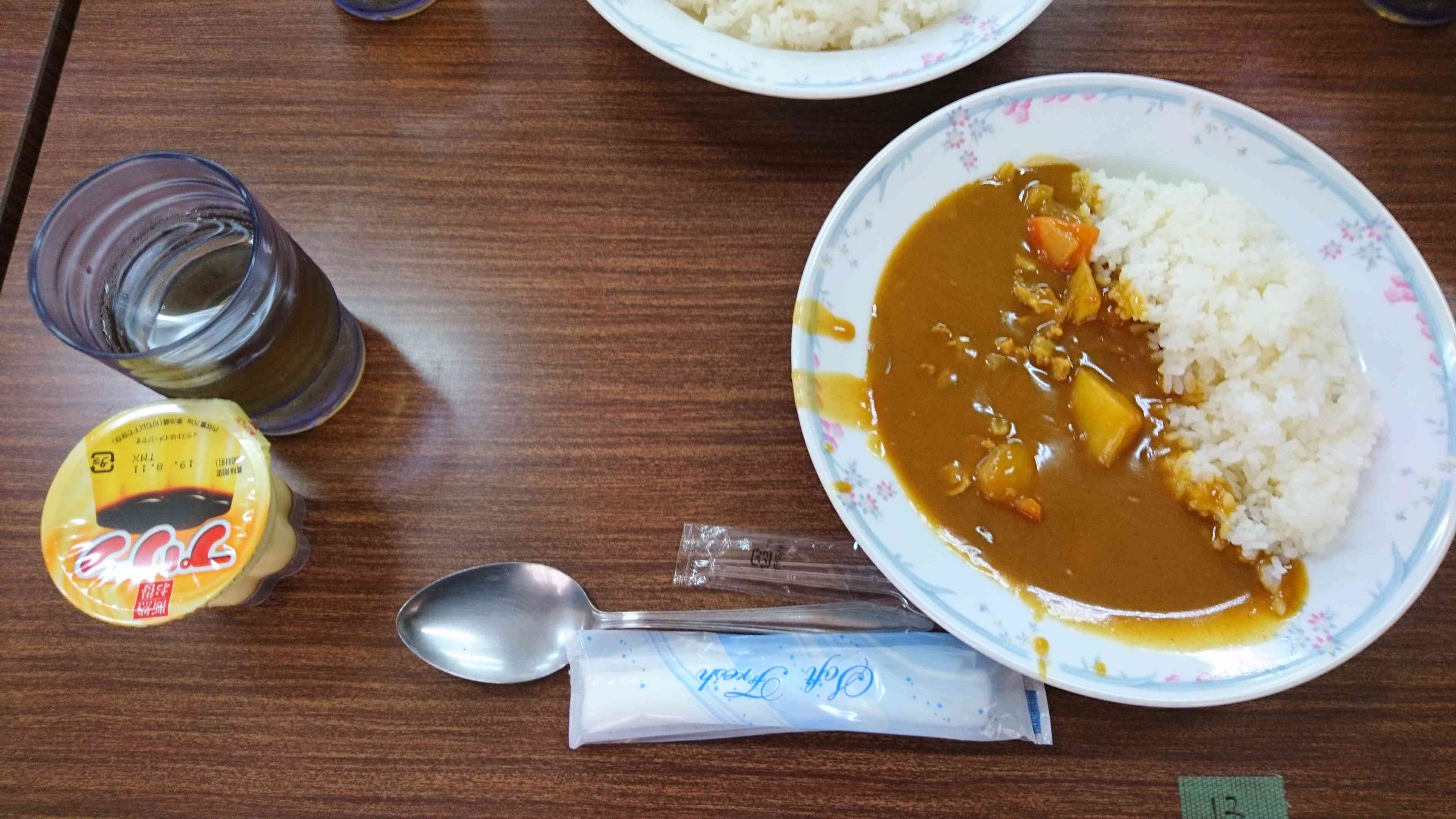 2日目の昼食はカレーとプリンです。 昼になって日差しが強くなってきました。 午後たくさん泳ぐためにたくさん食べています。