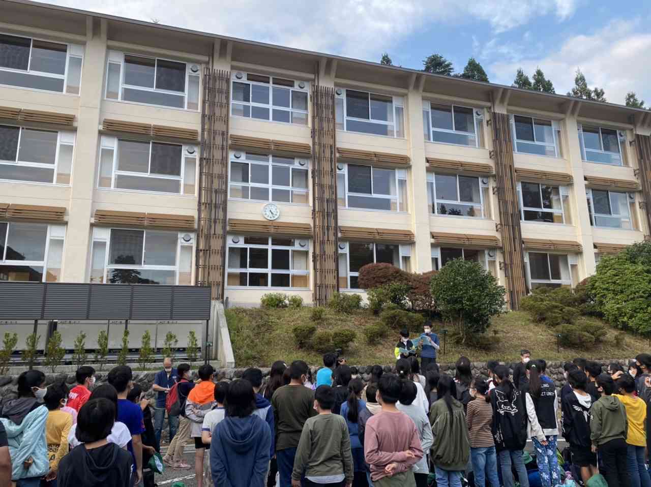 開園式では、1泊2日お世話になる管理人さんへ挨拶をしました。 こどもたちの前にあるのが新しくなった宿舎です。