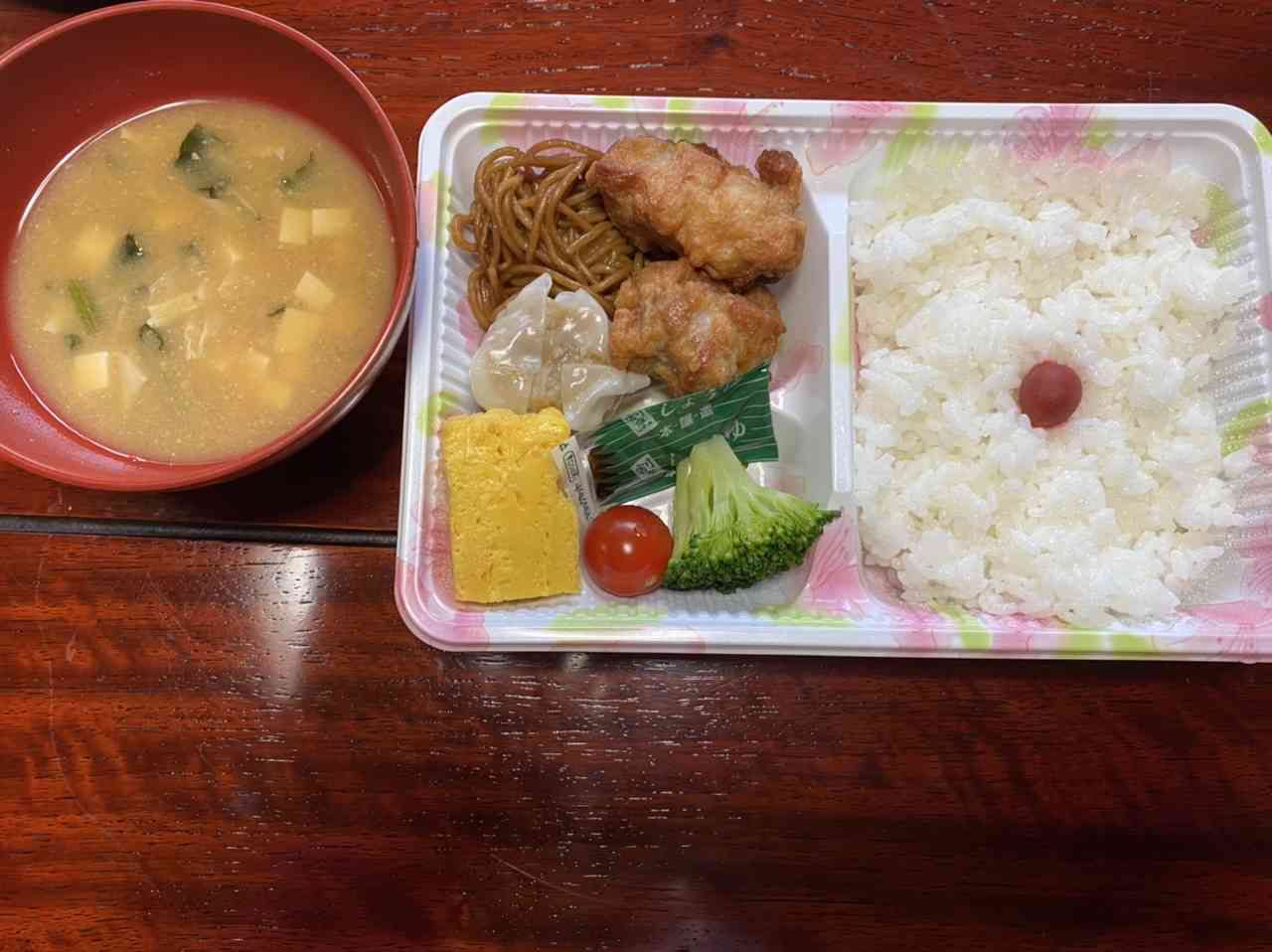 2日目の昼食は ・ごはん ・鶏肉のからあげ ・シューマイ ・厚焼き卵 ・ソース焼きそば ・ブロッコリー、トマト です。