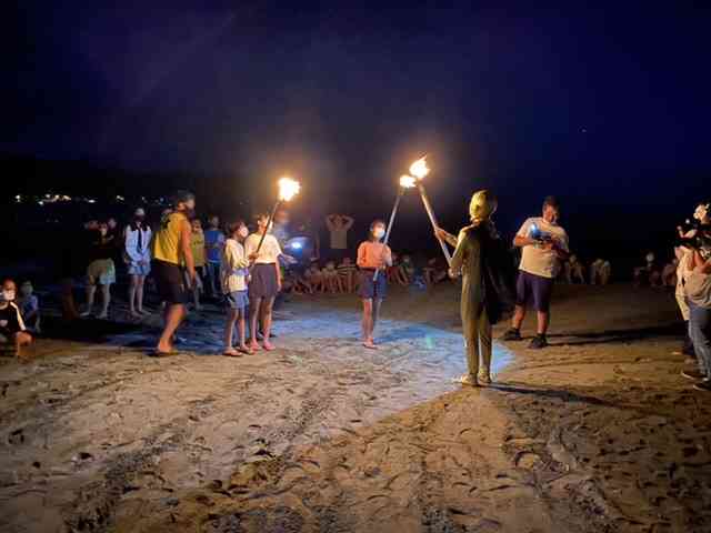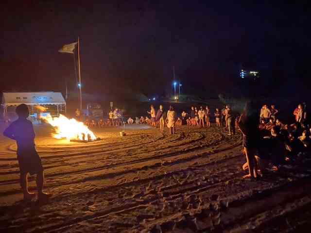 水泳後の入浴を済ませたら夕食です。水泳でたくさん動いたからか、たくさん食べていました。 夕食後はキャンプファイヤーです。レク係を中心に準備を進めました。 海岸で行うキャンプファイヤーは大盛り上がり。火の勢いに目を輝かせながらレクや歌、ダンスを楽しんでいました。 天気にも恵まれ、たくさん活動できた1日でした。
