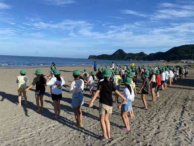 2日目の朝です。昨晩は水泳の疲れからか、すぐに眠りに入る子が多かったです。 今朝は6時に起床し、海岸で朝会です。ラジオ体操をして頭と体を起こします。 朝食を食べ、これから水泳です。今日は午前午後と水泳があります。昨日の水慣れに続き、徐々に長い距離を、ゆっくり泳ぐことに挑戦します。