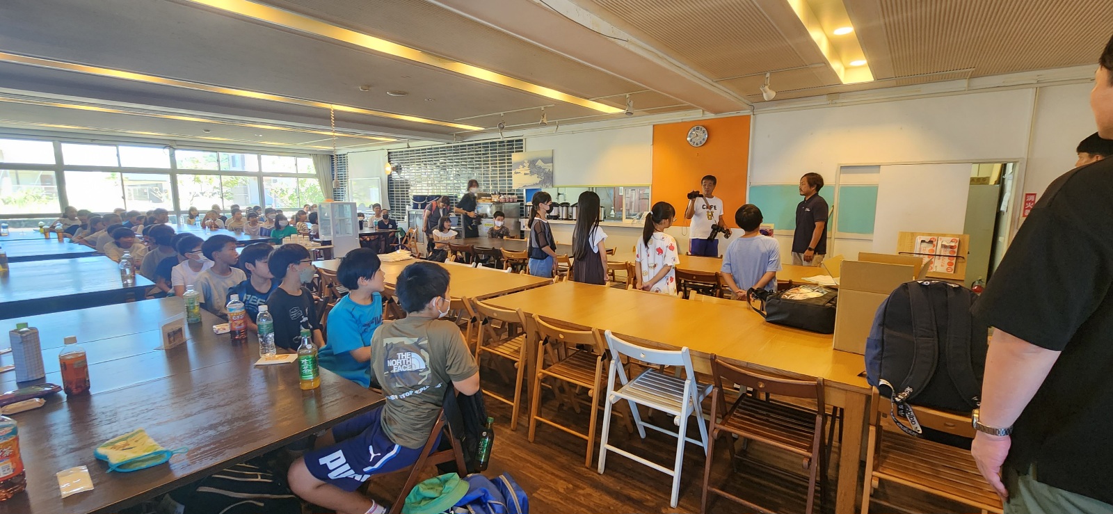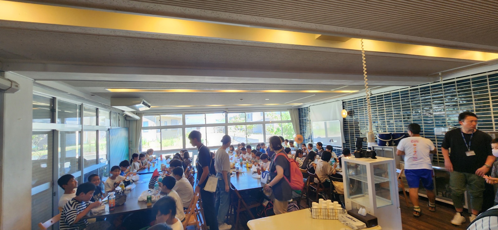 開校式 「わあ、海だ!色がきれい!」とバスの中でたくさんの声を聞きました。 宿に着き、開校式です。 これから三日間お世話になる方々へ挨拶をして、お昼ごはんです。 おうちの人が作ってくれたお弁当を美味しそうに食べました。 このあとは、いよいよ海へ入ります!
